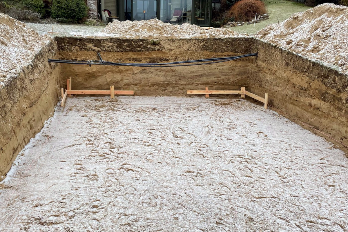Im ersten Schritt wird die Baugrube fachgerecht ausgehoben. Dabei achten wir auf exakte Maße und saubere Kanten, um eine stabile Grundlage für den späteren Pool zu schaffen. Bestehende Leitungen werden sorgfältig gesichert und vermessen.