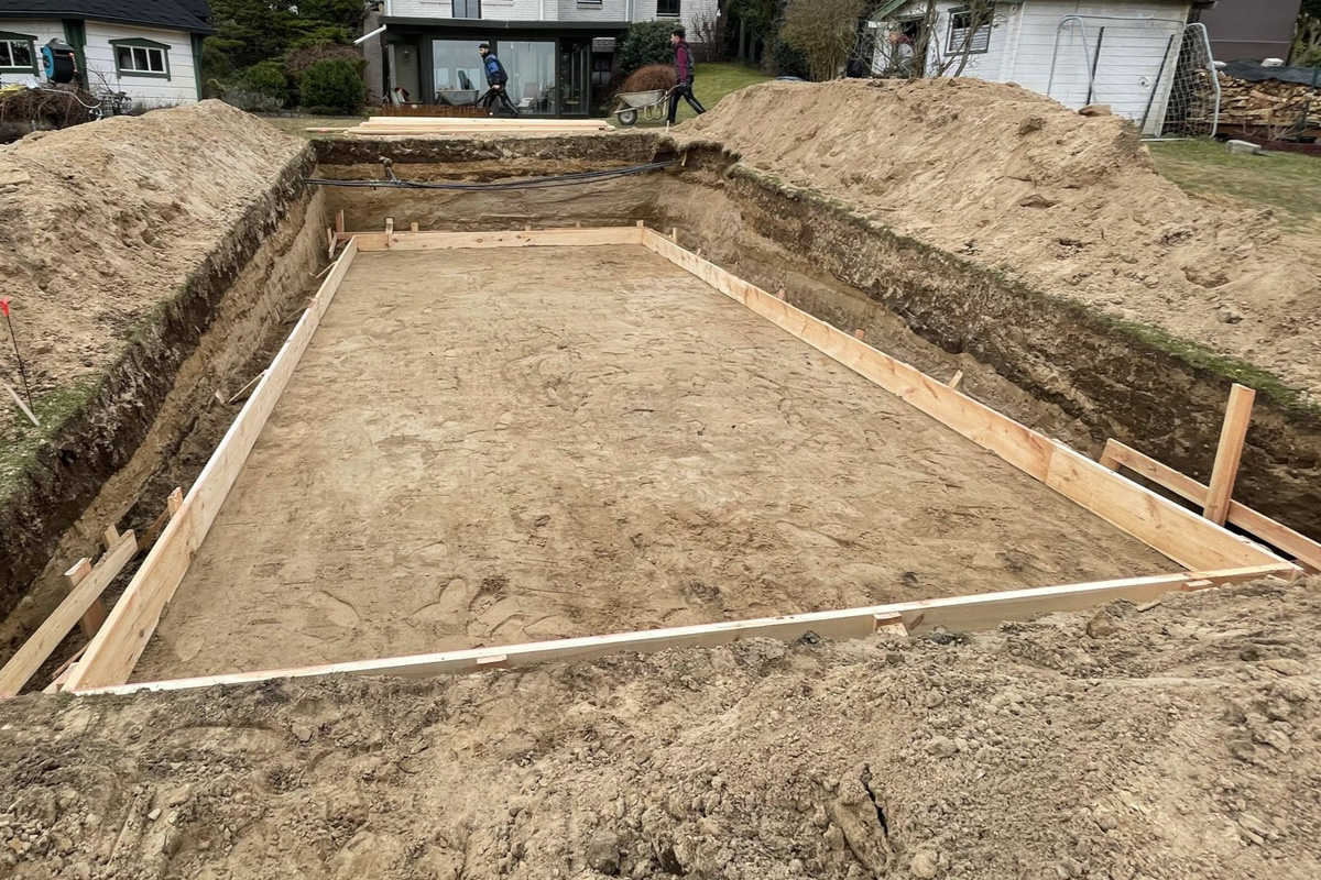Nach dem Aushub wird der Untergrund verdichtet und nivelliert. Die äußere Schalung für die Bodenplatte wird gesetzt - ein wichtiger Schritt für die spätere Maßgenauigkeit des Beckens.