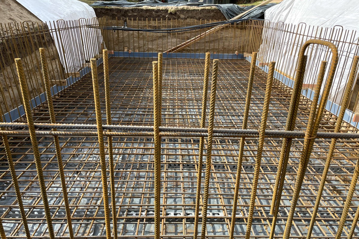 Anschließend erfolgt das Einbringen der Bewehrung. Eine stabile Stahlarmierung ist unerlässlich für einen langlebigen, druckstabilen WU-Betonpool. Hier werden bereits auch die vertikalen Elemente für die Wände vorbereitet.