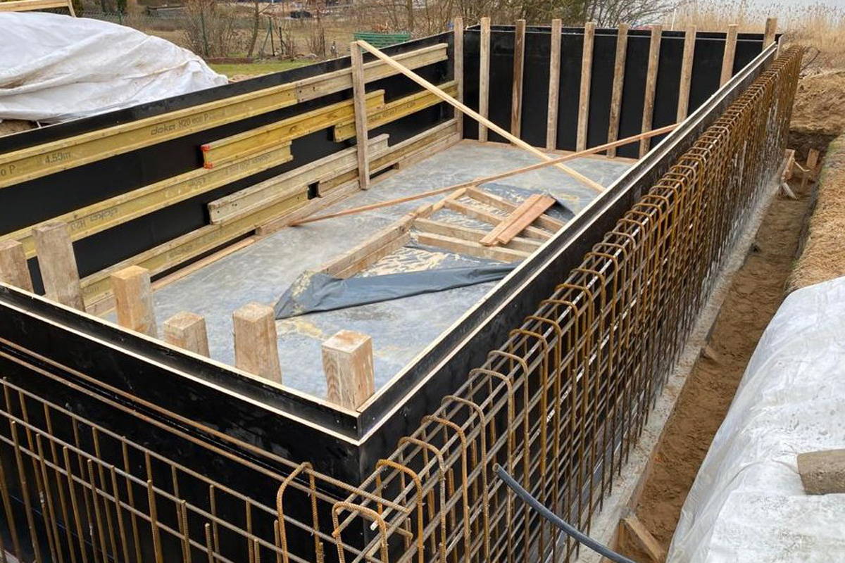 Die Schalung für die Wände wird errichtet. Sie sorgt dafür, dass der Beton exakt in Form gebracht und die typische glatte Betonoptik erreicht wird. Die Armierung wird in diesem Schritt vollständig eingebettet.